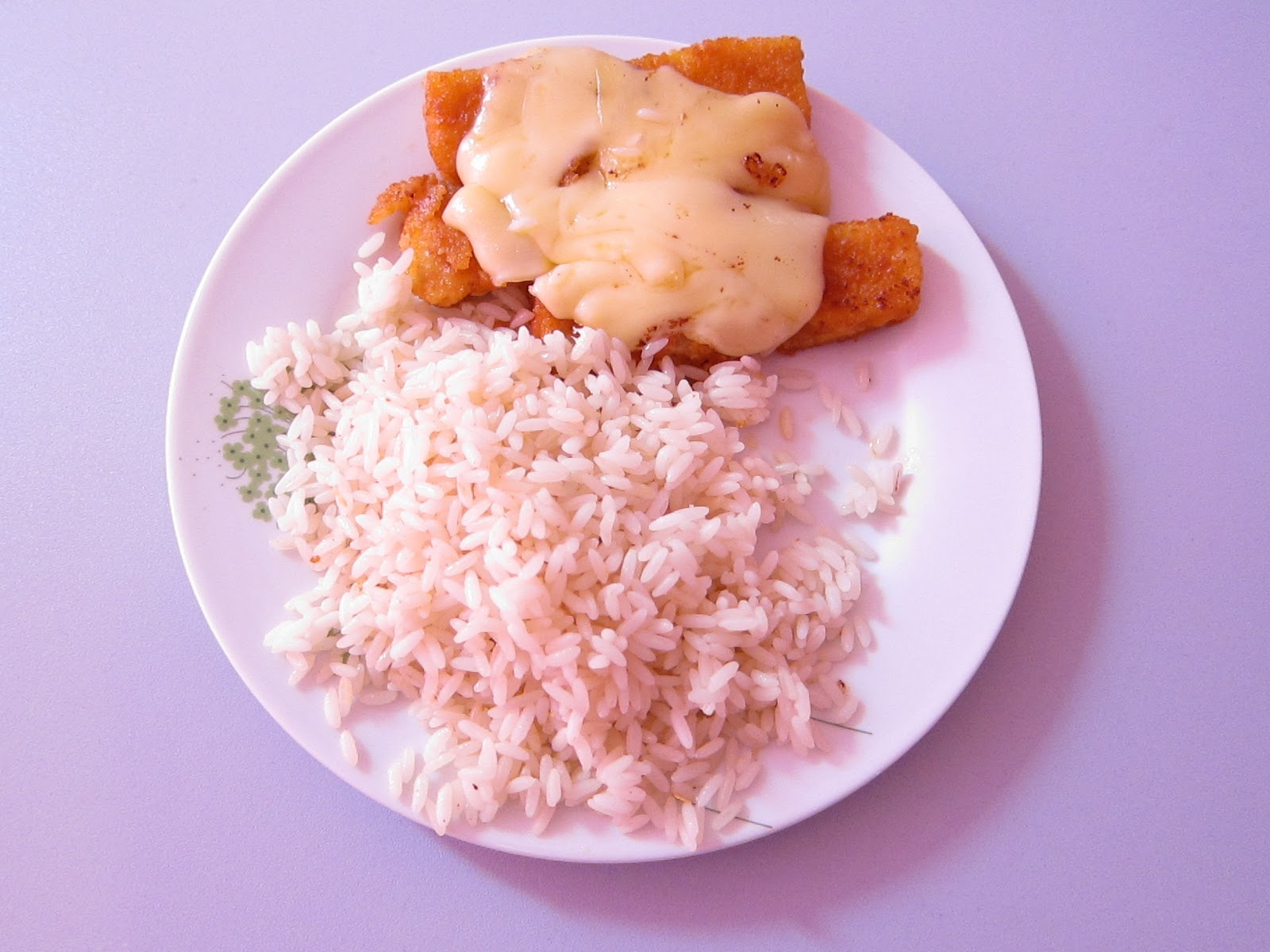 Fish fillet, melted gouda cheese, and rice for lunch! Family, be proud. :)